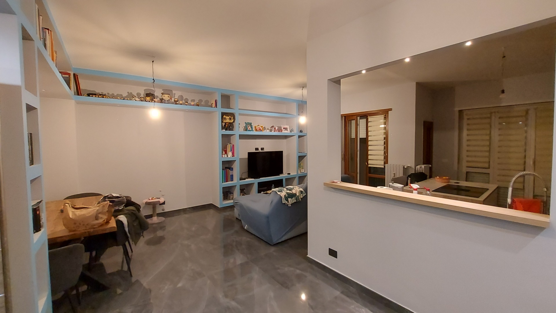 Ristrutturazione completa di appartamento con realizzazione di ampio soggiorno open space avente grande parete attrezzata in cartongesso costituita da libreria, mobile TV e caminetto ornamentale a bioetanolo.